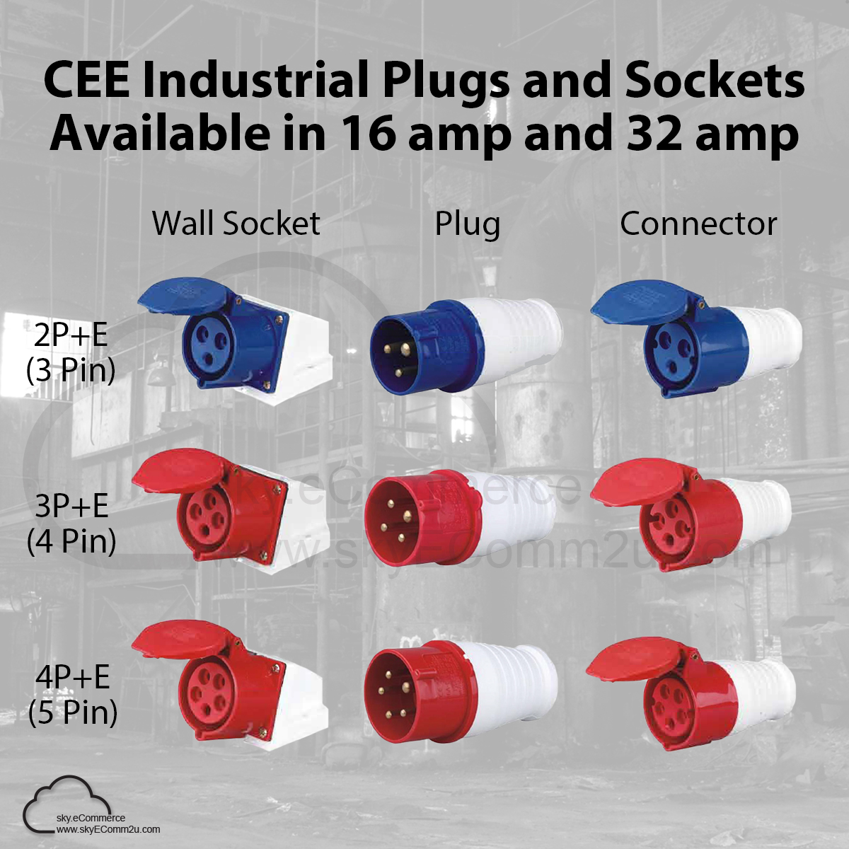 CEE INDUSTRIAL PLUG WALL SOCKET CONNECTOR 16A 32A 3 PIN 4 PIN 5 PIN BLUE RED SINGLE PHASE 240V