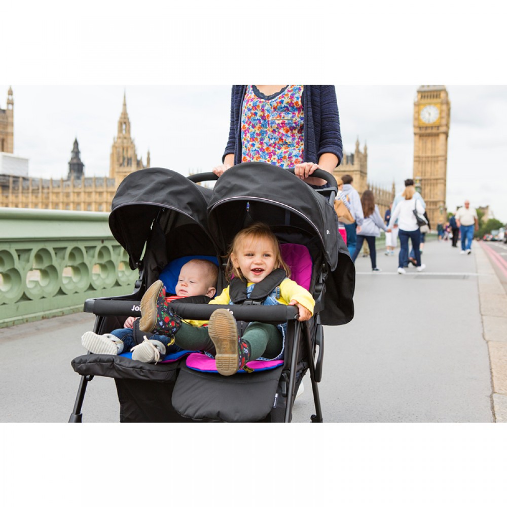 The Joie Aire Twin Aire, is a double buggy suitable from birth to 4 years (15kg) It includes two reversible seat liners plus individual canopies and two footmuffs to keep your babies cozy and warm. The pushchair is suitable for twins and toddler and newborn. Features. The fully padded Soft Touch 5-point safety harness is ultra-soft and gentle.