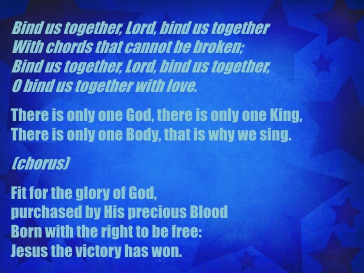 Bind Us Together. Bind us together, Lord Bind us together With cords that cannot be broken Bind us together, Lord Bind us together Bind us together in Love There is only one God, There is only one King There is only one Body, That is why we sing. Fit for the glory of God, Purchased by His precious Blood Born with the right to be free Jesus the.