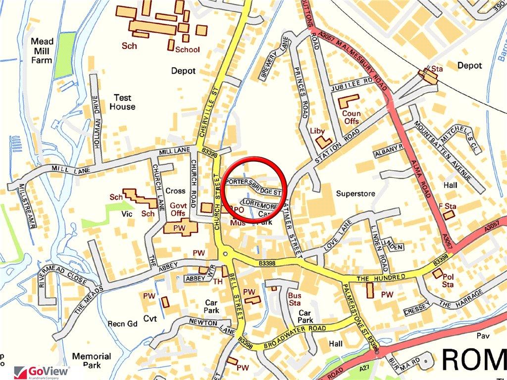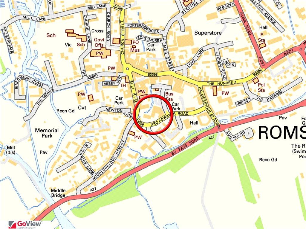 In this view of Romsey you can also see: The Romsey School, the Abbey Hotel, the Star Inn, Plaza Theatre, Romsey Sports Centre, the Three Tuns, Romsey Abbey C of E Primary School, the Old House at Home, New Life Church, Romsey Town Council, and numerous other Romsey services, pubs, facilities, businesses, bus stops, sports centres, heath facilities, restaurants, B&B's, and amenities in Romsey.