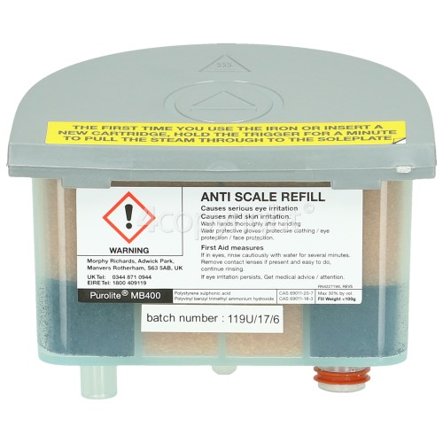 Genuine Morphy Richards Anti Scale Cartridge Part Number: 011331 Anti scale cartridge for Power Steam Intellitemp Steam Generator Irons. Model Numbers 333000, 333001, 333005, 333006, 333007
