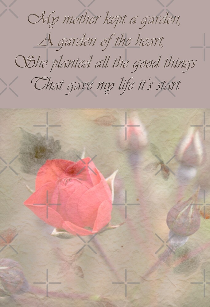 My Mother Kept a Garden - unknown. My Mother kept a garden. A garden of the heart; She planted all the good things, That gave my life it's start. She turned me to the sunshine, And encouraged me to dream: Fostering and nurturing The seeds of self-esteem. And when the winds and rains came, She protected me enough; But not too much, she knew.