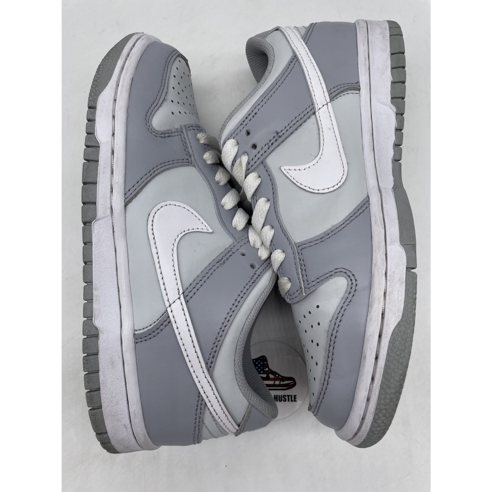 Product Description. The Nike Dunk Low Two Tone Grey arrives with a light grey leather upper with darker tonal overlays and white Swooshes. A nylon tongue with a woven Nike label offers flexibility and comfort. At the base, a white and grey Air sole completes the design. The Nike Dunk Low Two Tone Grey released in 2022 and retailed for $100.
