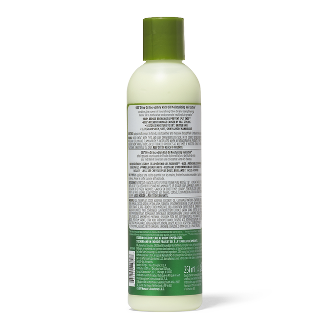 The ORS Olive Oil Incredibly Rich Moisturizing Lotion Formulated with Black Castor Oil, this daily hair lotion restores hair natural moisture balance, imparts long-lasting. Add Shine and provides maximum heat protection. With consistent use, hair will begin to show improved elasticity, hydration and add shine..