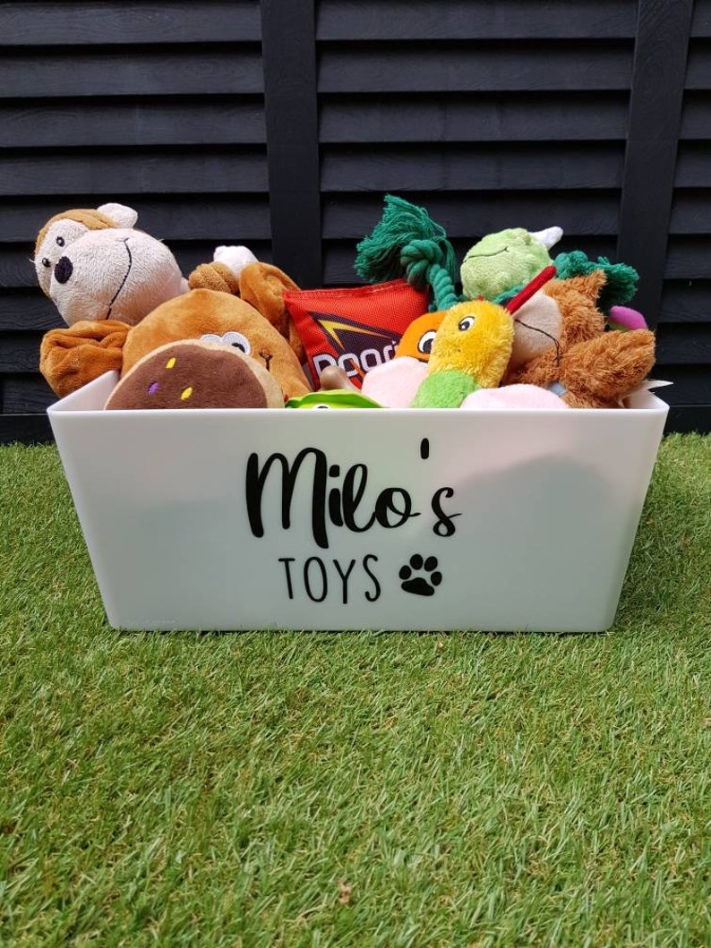 Dog Toy Basket Personalized Pet Toy Storage Plastic Basket Toy Storage Bin Pet Toy Box Personalized with Your Pet's Name Cat Toys Dog Bone. (5.3k) $12.95. Personalised Dog Toy Box, crate for puppy and dog toys. Ideal dog owners gift.