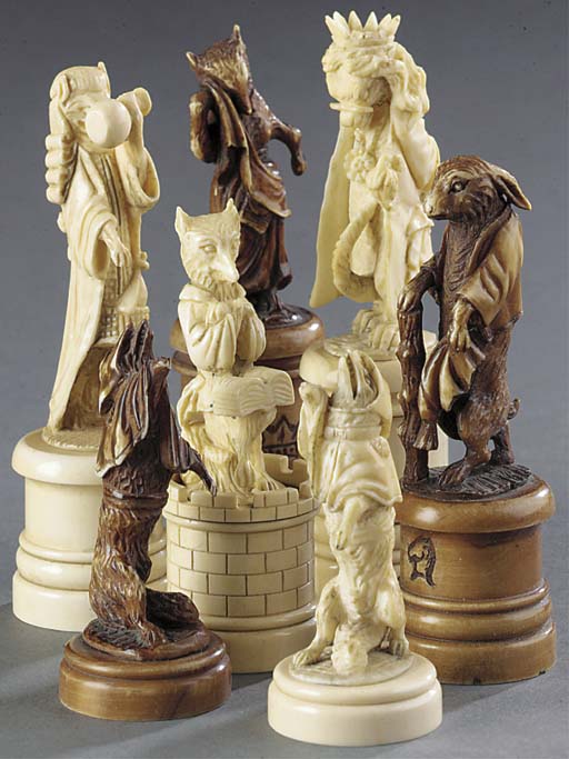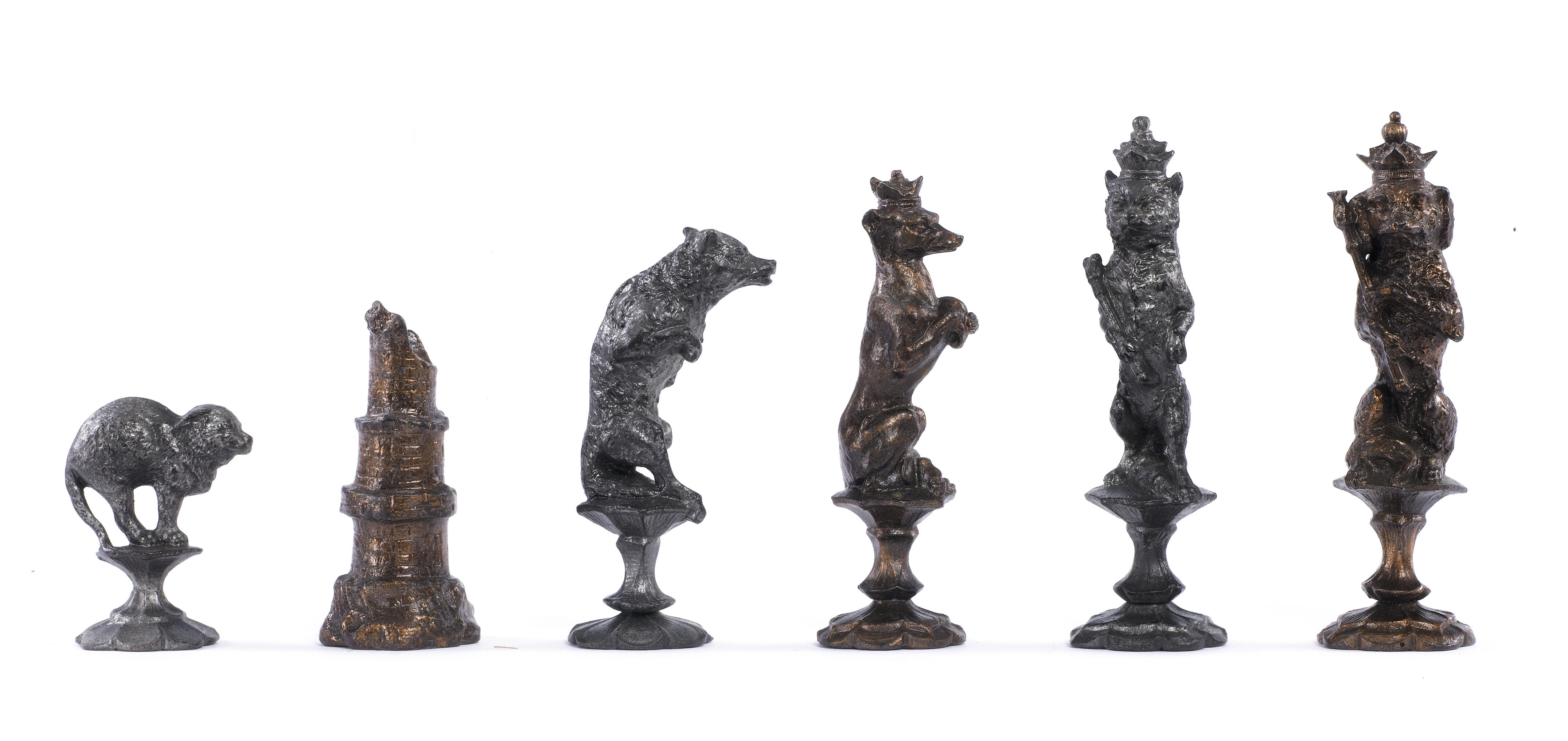 Bonhams A cast iron Reynard the Fox figural chess set by the Zimmerman Foundry, Hanau, Germany